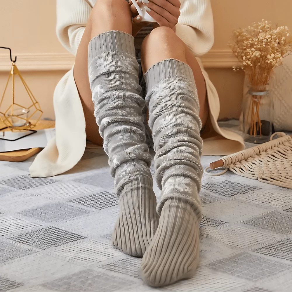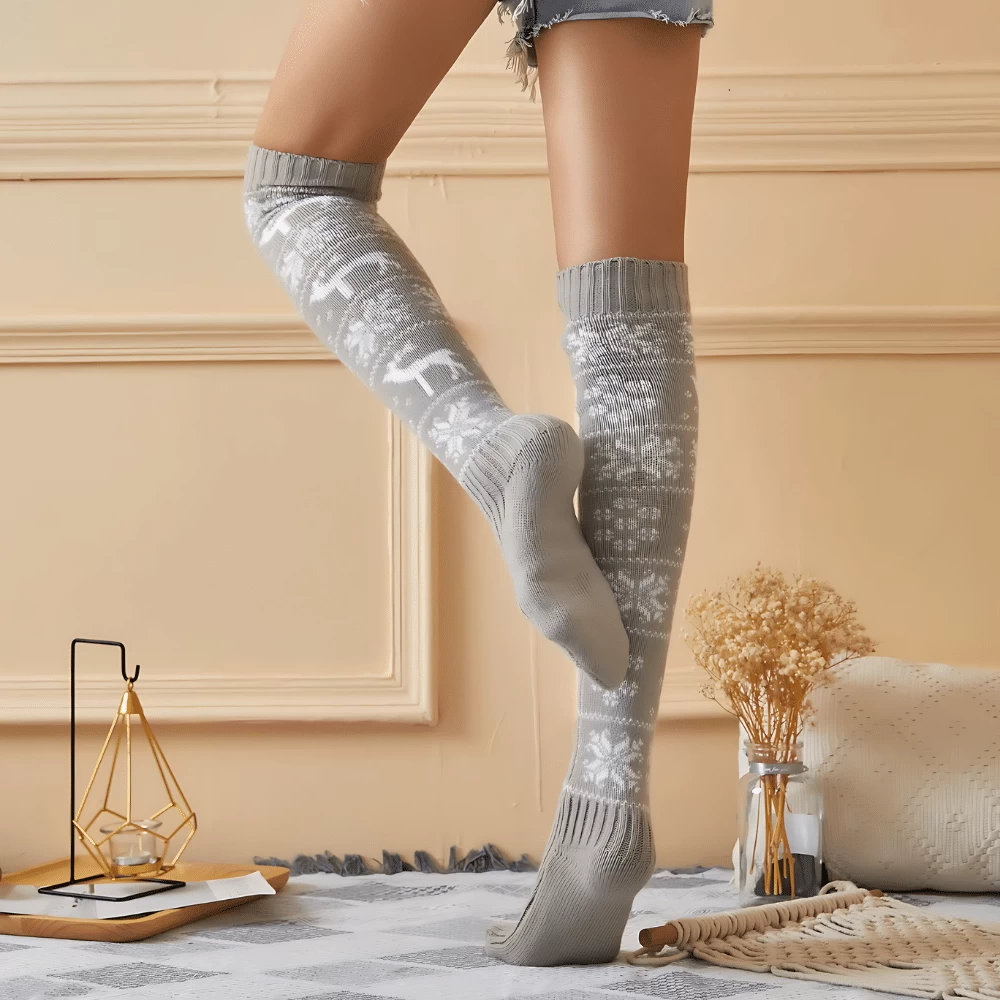 Ces chaussettes montantes arborent des motifs de Noël traditionnels, avec des rennes et des flocons qui évoquent immédiatement l’esprit des fêtes. Parfaites pour créer une ambiance chaleureuse, elles sauront vous plonger dans la magie de l’hiver. Le choix des couleurs, blanc, gris clair ou rouge, s’accordera avec toutes vos tenues de saison tout en ajoutant une note joyeuse à vos moments de détente.