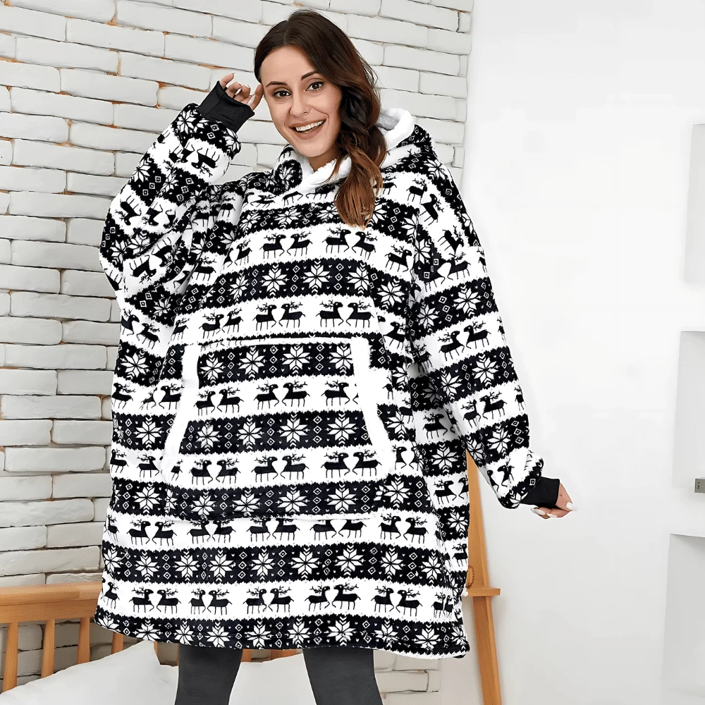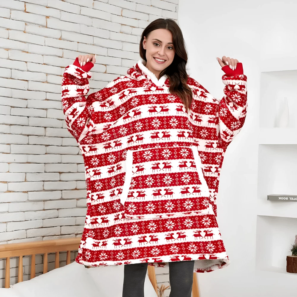 Affichez l’esprit de Noël avec les motifs renne et flocons de ce plaid de Noël, symbole parfait pour la saison ! En rouge, noir ou bleu, ce pull plaid devient votre meilleur allié pour des moments cosy en famille. Il est assez élégant pour les photos de Noël tout en restant parfait pour les soirées détente. Ambiance festive garantie !